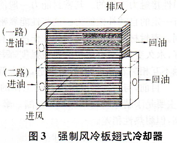 由液壓系統(tǒng)于風冷式冷卻器適用于缺水或不便用水的機械上,故建筑機械已廣泛應用。圖3所示是強制通風板翅式冷卻器,多用在液壓挖掘機上。它的優(yōu)點是鋁麓、散熱效率高,結構緊湊、體積小、強度大。缺點是易堵塞、清洗困難。