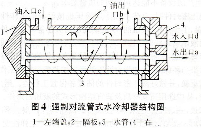 圖4是液壓系統(tǒng)一種強制對流管式 水冷卻器結構示意圖。油從左側的油口c進入,從右側b口流出,冷卻水從右端蓋4的孔d進入,經(jīng)多根水管3的內部,從孔a流出,油從水管外部流過,油與水通過水管表面的熱交換起到散熱的作用。